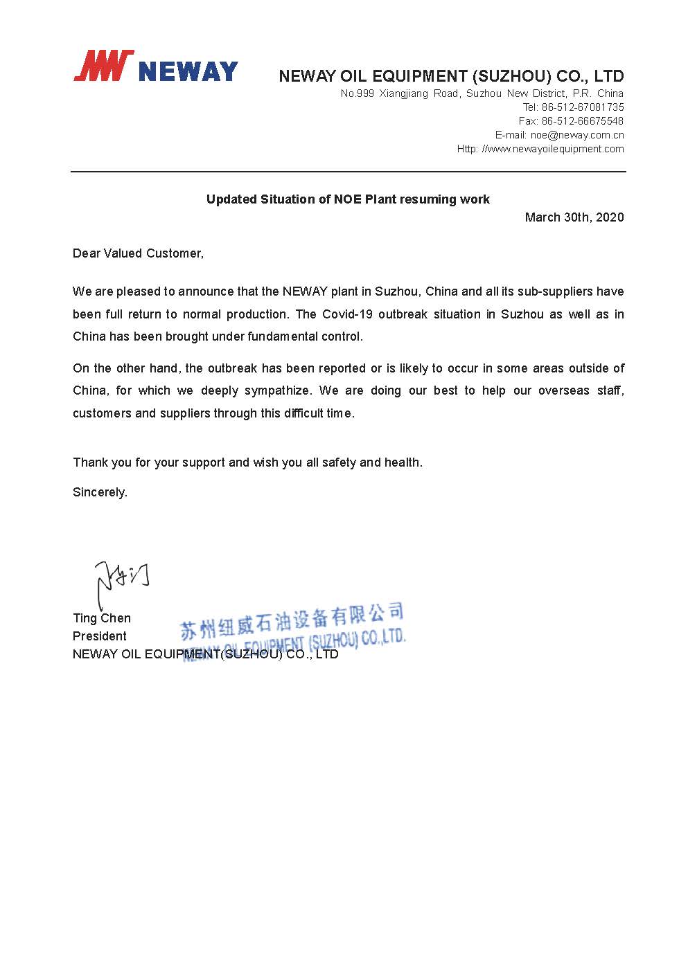 Dear Valued Customer, We are pleased to announce that the NEWAY plant in Suzhou, China and all its sub-suppliers have been full return to normal production. The Covid-19 outbreak situation in Suzhou as well as in China has been brought under fundamental control. On the other hand, the outbreak has been reported or is likely to occur in some areas outside of China, for which we deeply sympathize. We are doing our best to help our overseas staff, customers and suppliers through this difficult time. Thank you for your support and wish you all safety and health. Sincerely.